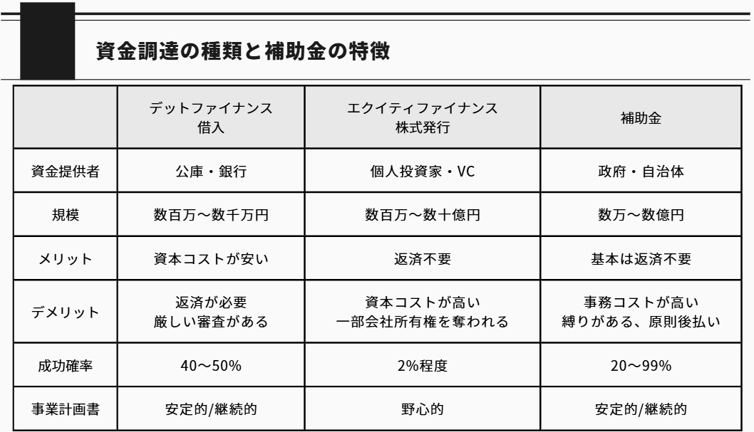 - 補助金:原則返済不要だが、事務コストと“使いみちの縛り”あり。成功確率は制度・準備次第で大きく変わります。