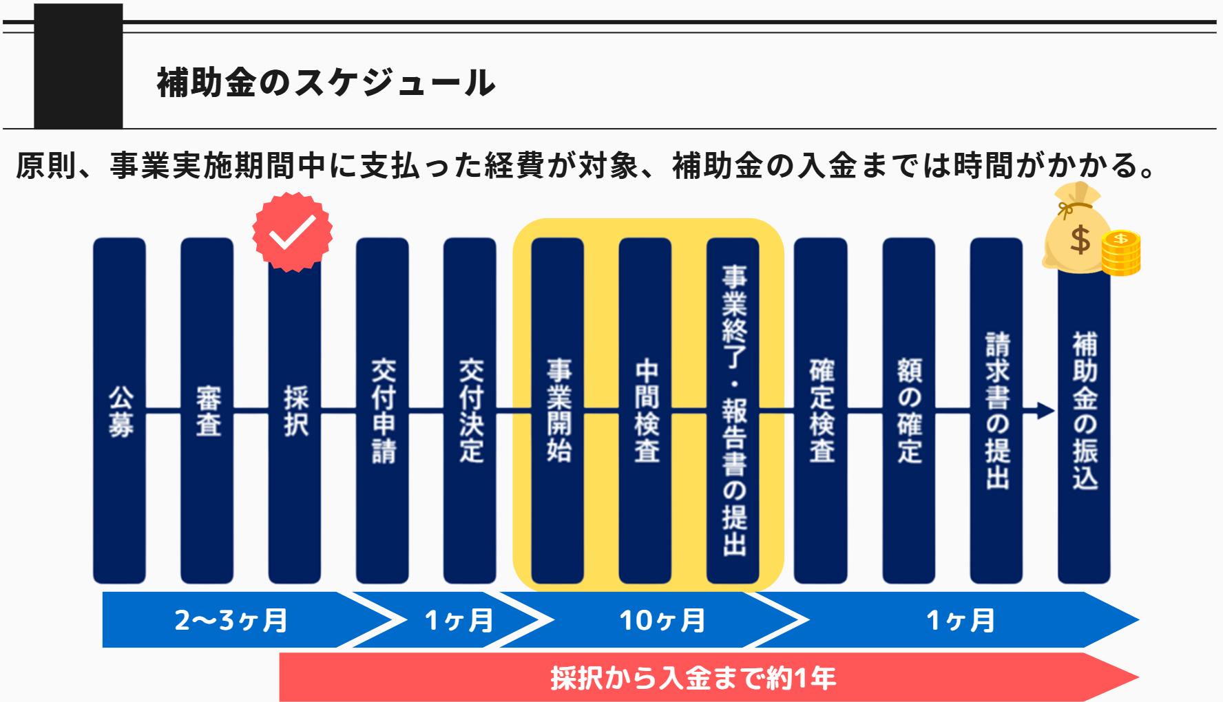 ※多くの制度で採択〜入金まで約1年見込み。フォローアップ報告も忘れずに。